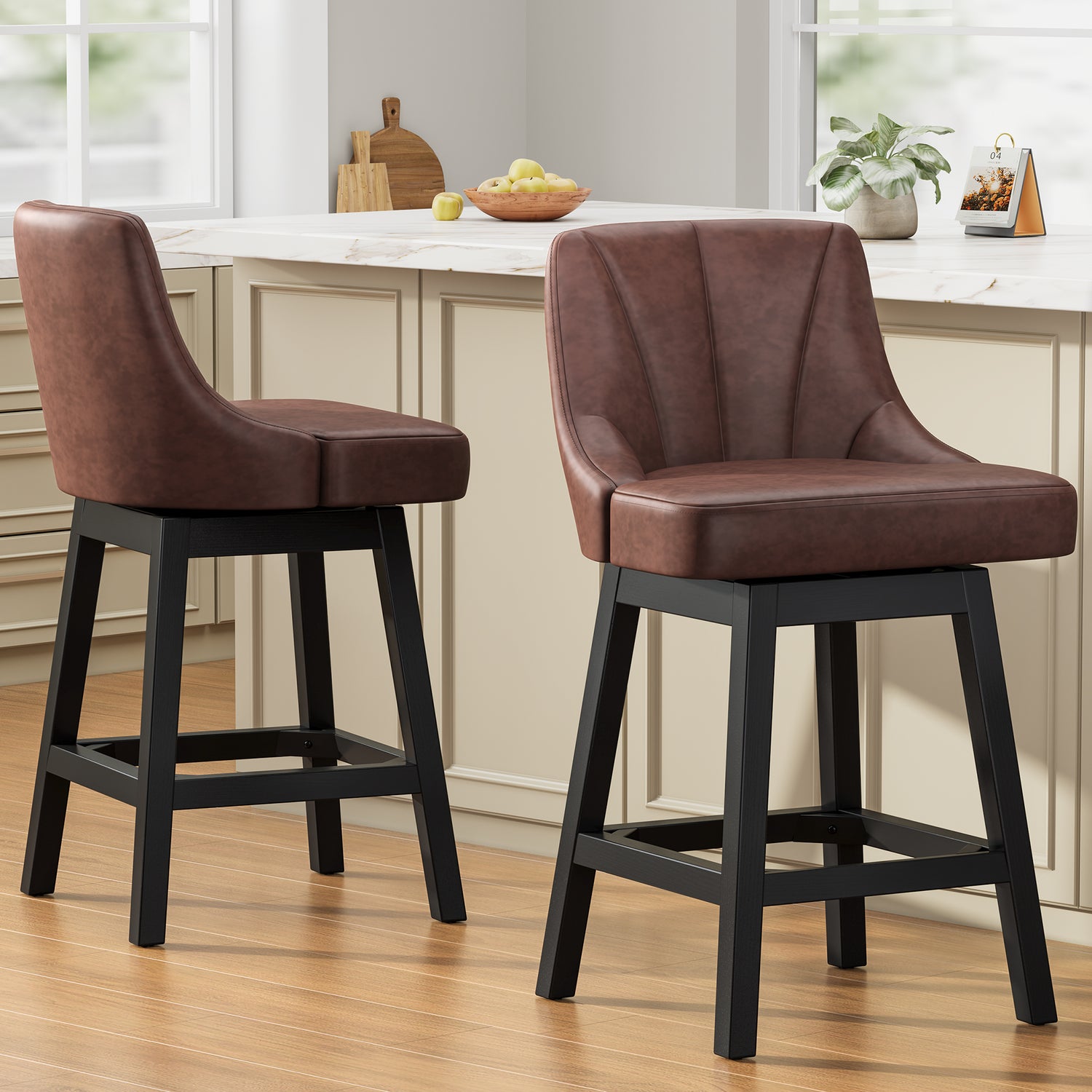 YaFiti Swivel Bar Stools with Backs, 26" Counter Height Bar Stools Set of 2, Modern Leather Extra Upholstered Counter Barstools with Square Solid Wood Legs for Kitchen Island, Dining Room, Brown
